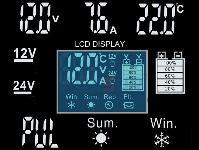 - LCD jelző a töltés állapotáról, feszültségről és áramról