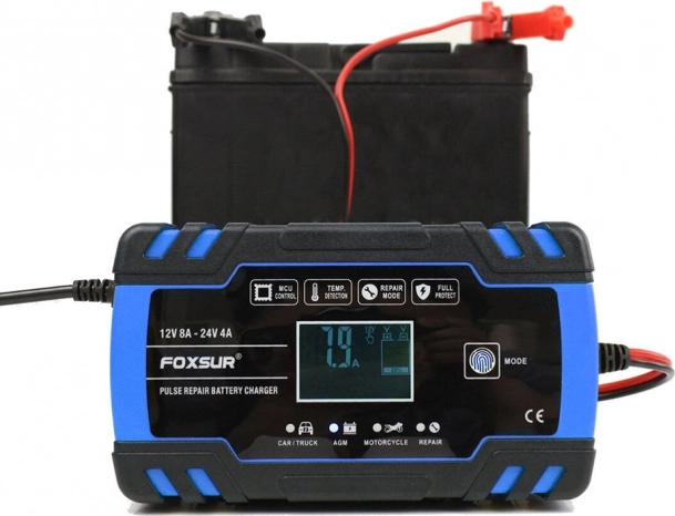12 V és 24 V akkumulátorok támogatása, töltőáram akár 8 A (12 V) és 4 A (24 V) a gyors és biztonságos akkumulátortöltéshez autóban vagy motorkerékpárban.