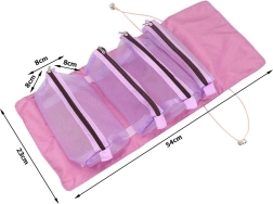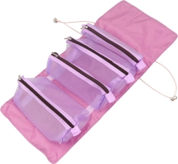 Praktikus utazó kozmetikai rendező négy kivehető, cipzáras zsebbel és felakasztható kialakítással. Az átlátszó rekeszeknek köszönhetően mindent könnyen áttekinthet, a rendező egyszerűen feltekerhető és minimális helyet foglal. Ideális kézitáskába és bőröndbe is a rend, a gyors hozzáférés és a biztonságos tárolás érdekében kozmetikumokhoz és apróságokhoz.