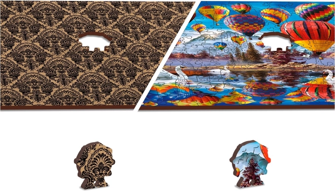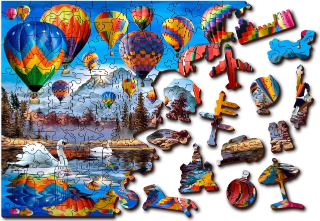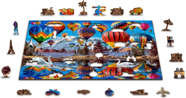 Elegáns és szórakoztató kihívás a kirakók szerelmeseinek. A hőlégballon-motívumú fa puzzle egyedülálló élményt nyújt a 61 különlegesen formázott állat-, épület- és tárgyalakú elemmel. Néhány darab önálló kis figuraként is felállítható, így a puzzle remek ajándék és stílusos dekoráció is.