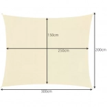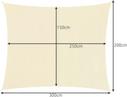Téglalap alakú, 3×2 m-es árnyékoló ponyva strapabíró poliészterből, fém gyűrűkkel, amely hatékony védelmet nyújt a nap ellen, és részben az esővel szemben is. Kellemes árnyékot biztosít, javítja a légáramlást és gyorsan szárad. A szerelőgyűrűknek és a mellékelt köteleknek köszönhetően könnyen kifeszíthető teraszon, kertben vagy erkélyen. Vízlepergető anyag, egyszerű telepítés és sokféle rögzítési lehetőség a kényelmes kültéri tartózkodáshoz.