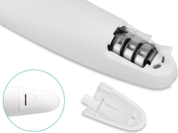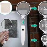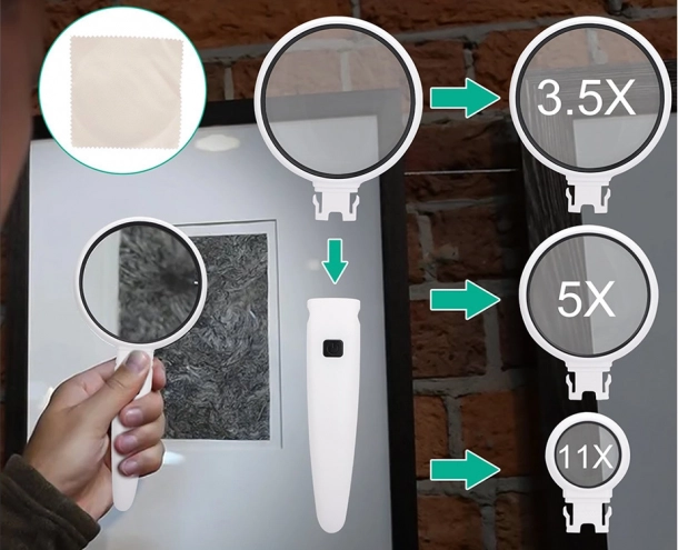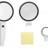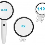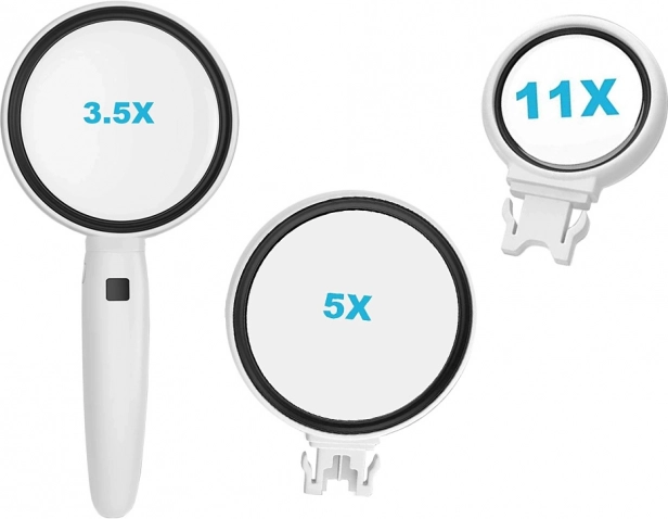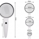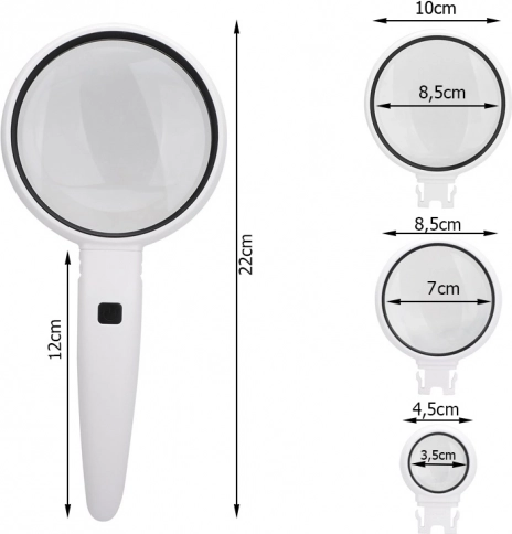 Praktikus kézi nagyító ergonomikus markolattal és 2x LED világítással a részletek tiszta, kényelmes megtekintéséhez. A csomagban 3 cserélhető lencse található 3,5x, 5x és 11x nagyítással, ideális olvasáshoz, numizmatikához, ékszerekhez és precíz otthoni munkákhoz. Tápellátását 3× LR44 elem biztosítja (tartozék).