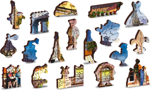 A puzzle darabjai híres épületeket, állatokat és tárgyakat ábrázolnak, a tematikus motívumnak megfelelően.