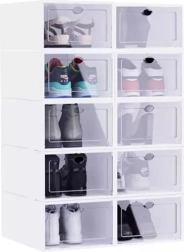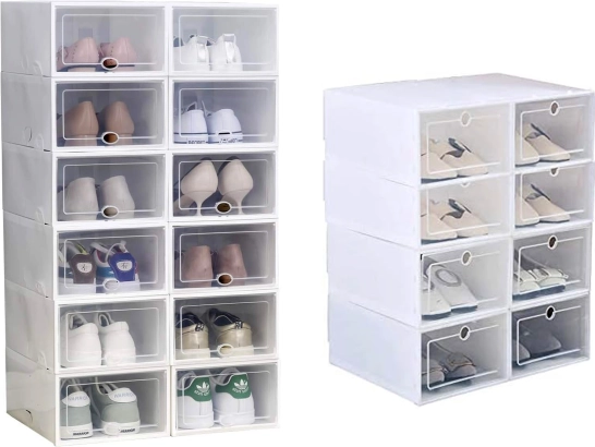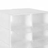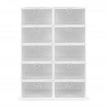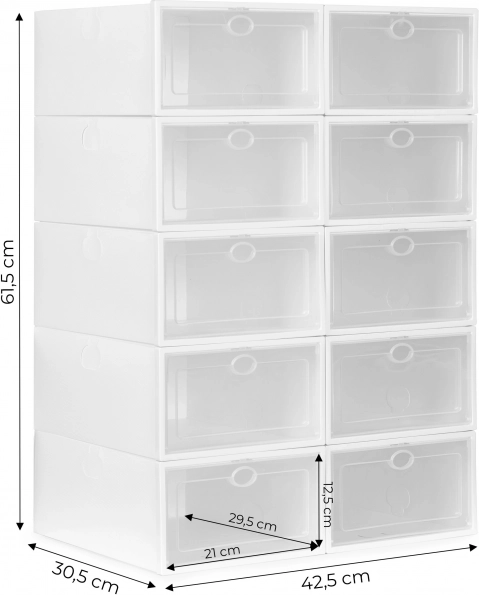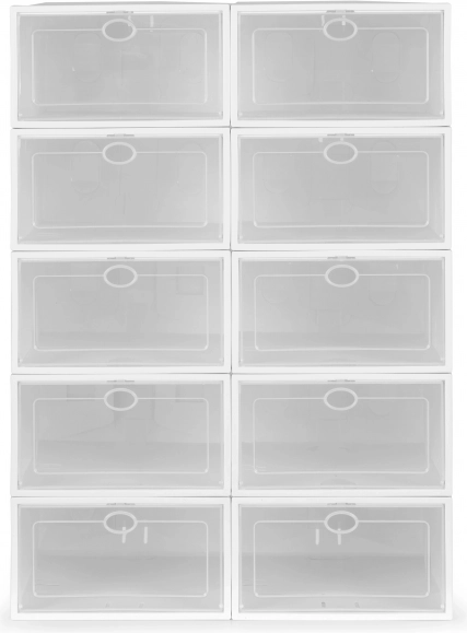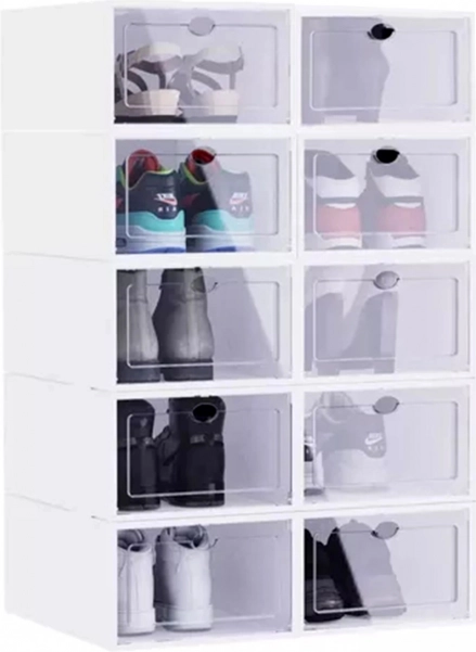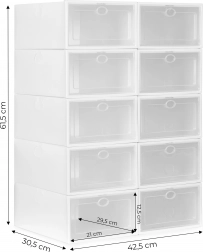 A fogantyús, átlátszó ajtók megkönnyítik a pár kiválasztását a doboz kinyitása nélkül, és megvédik a cipőket a portól és a nedvességtől. A tartós műanyag könnyen karbantartható, és ideális az előszobába, a gardróbba és a gyerekszobába is.