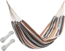 Élvezze a nyári pihenést bárhol ezzel a tágas, kétfős függőággyal. Masszív kialakítás, strapabíró, légáteresztő textil és egyszerű felfüggesztés a mellékelt kötelekkel. A legfeljebb 200 kg teherbírásnak, a kompakt hordtáskának és a stílusos csíkoknak köszönhetően ideális kertbe, teraszra, erkélyre és kempingezéshez is.