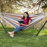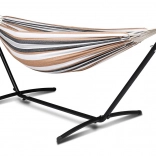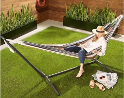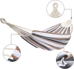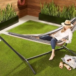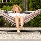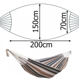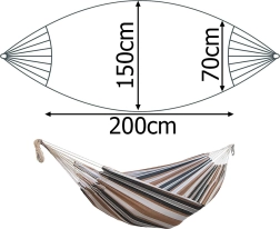 A 200 × 150 cm-es fekvőfelület kényelmet nyújt egy vagy két személy számára. A sűrűn szőtt felfüggesztő zsinórok egyenletesen oszlatják el a súlyt a stabil és biztonságos ringatózásért. A légáteresztő szövet kellemes tapintású és könnyen karbantartható – géppel mosható.