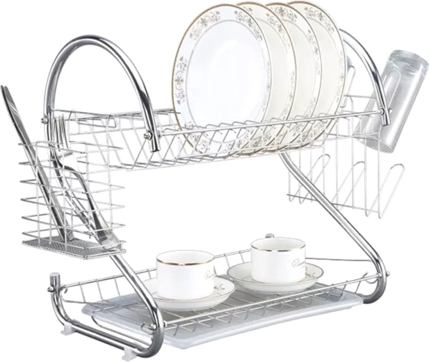 Krómozott, kétszintes edényszárító edényekhez és evőeszközökhöz, csepegtetőtálcával. A felső szintre könnyedén elfér akár 15 tányér. Az alsó szinten áttekinthetően elrendezhetők a poharak és csészék. Kivételesen tágas, és nélkülözhetetlen kiegészítő minden konyhában! Minden edényének és evőeszközének jut benne hely! Kompakt méreteinek köszönhetően könnyen elrejthető a konyhaszekrényben! Számos kivehető elemmel rendelkezik, például műanyag tálcával a lecsöpögő víz felfogására, kiegészítő evőeszköz-csepegtetővel és külső tartóval akár 6 pohár számára. Igazi konyhai kombinátor, amely hatékonyan rendezi a konyhájában lévő összes edénykészletet!
