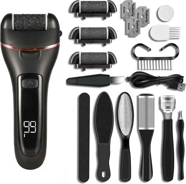 Elektromos sarokreszelő, ideális a talpakon kialakult túlzott megkeményedett bőr eltávolításához. Beépített akkumulátorral, LED világítólámpával és jól olvasható LCD kijelzővel rendelkezik, amelyek jelentősen megkönnyítik a használatot. Karcsú és kompakt kialakítása biztos fogást nyújt, így a munka nem fárasztja a kezet. A csomag tartalmaz 3 különböző szemcsézetű fejet (2 durva és 1 finom), valamint számos további kiegészítőt, például keféket és reszelőket a még precízebb ápoláshoz.