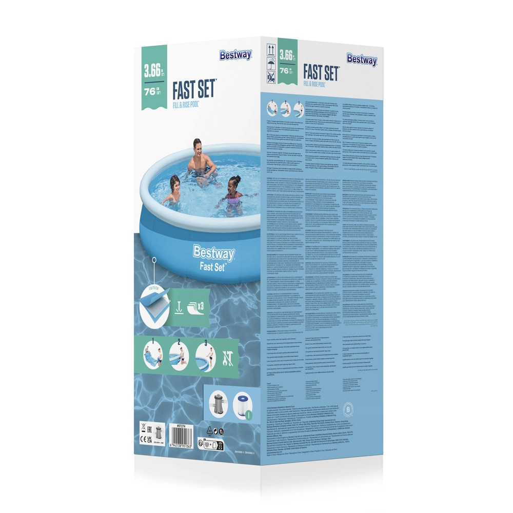 Élvezze a nyarat hosszas szerelés nélkül – a BESTWAY Fast Set 366 × 76 cm felfújható medencét csak ki kell bontani, felfújni a felső gyűrűt, majd vízzel megtölteni. Önhordó kialakításának köszönhetően stabil, gyermekek számára is biztonságos, és a áramlásszabályozós leeresztőszelepnek hála szezon végén könnyen leereszthető. A tartós, szakadásálló felületkezelésű anyag hosszú élettartamot biztosít. A csomag részét képezi a szűrőszivattyú I típusú szűrővel.