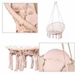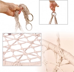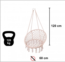 Ez a függő hintaszék kényelmes ülést kínál a pihenés és a lágy ringatózás pillanataihoz. A nagy, kör alak és a puha párna támogatják az ergonomikus testtartást, míg a masszív pamut kötélfonat és a fém váz biztonságot és hosszú élettartamot adnak.