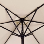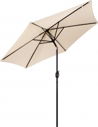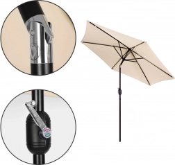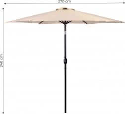 A minőségi 160 g/m² poliészter huzat ellenáll a napnak és az enyhe esőnek, a masszív acél váz (ø 38 mm) hat bordával tartja a formát és növeli a stabilitást. A minimalista dizájn és a bézs kivitel illik teraszra, kertbe, erkélyre és kempingezéshez is.
