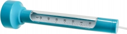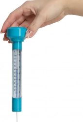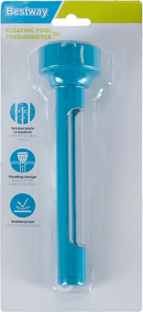 A hőmérő tartós műanyagból készült, és áttekinthető skálával rendelkezik Celsius és Fahrenheit fokokban. A mellékelt rögzítőkötél segítségével könnyen a létrára, lépcsőre vagy a medence szélére erősíthető, hogy ne sodródjon el.