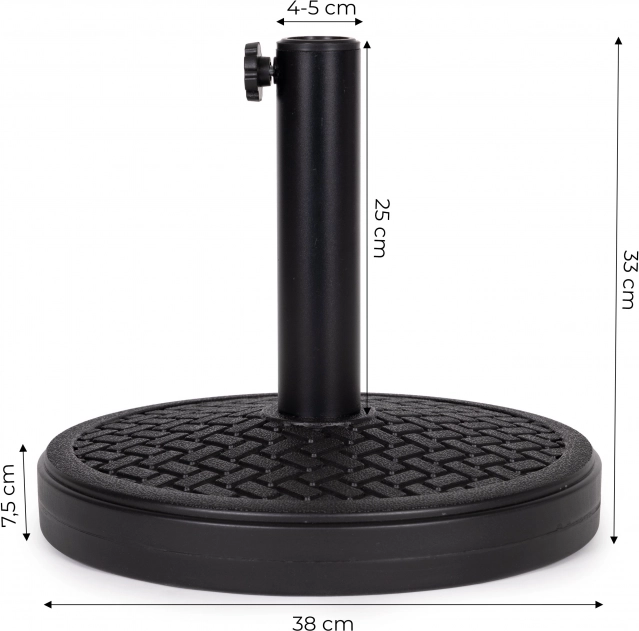 Az alap átmérője 38 cm, magassága 7,5 cm, teljes magassága pedig 33 cm. Ideális méretek a stabilitáshoz.