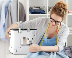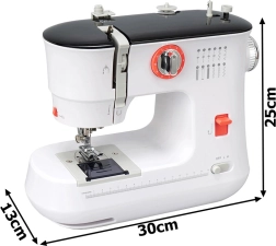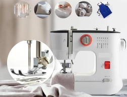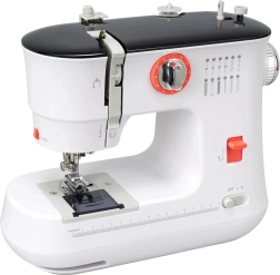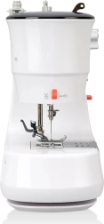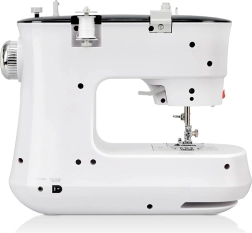Ez a fehér varrógép kicsi és könnyen hordozható, ideális gyors varrási módosításokhoz és kisebb otthoni projektekhez.