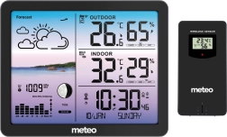 A METEO SP107 okos meteoállomás pontos időjárási adatokat hoz el közvetlenül az otthonába. Kínál vezeték nélküli hőmérséklet- és páratartalom-mérést beltéren és kültéren, barométert nyomásgrafikonnal, időjárás-előrejelzést piktogramokkal, Hold-fázisokat, komfortindexet és DCF rádióvezérelt órát ébresztővel és szundi funkcióval. Nem hiányzik a hőmérsékleti és fagyriasztás sem, valamint az áttekinthető színes kijelző az egyszerű leolvasásért.