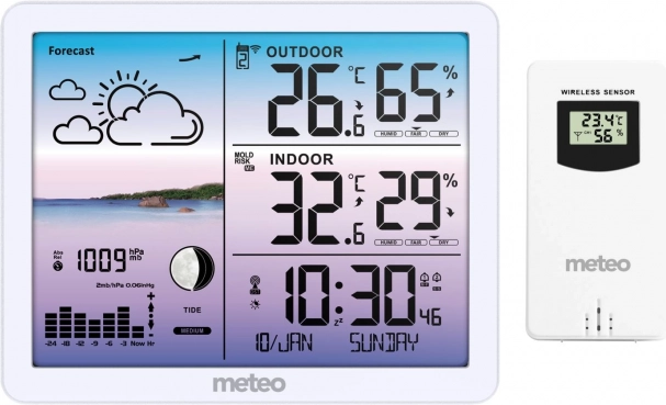 A METEO SP107 időjárás-állomás megjeleníti az aktuális beltéri és kültéri hőmérsékletet (kültéren -30–+50 °C), a páratartalmat, az légnyomást, és 12–24 órás időjárás-előrejelzést ad érthető ikonokkal. A DCF időkijelzés pontos időt tart fenn, az ébresztő szundi funkcióval is rendelkezik.