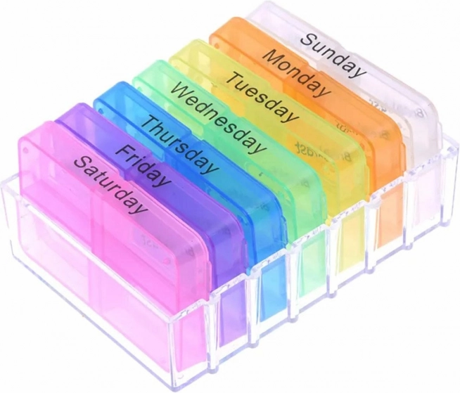 Praktikus tartó, gyógyszeres doboz. A szervező lehetővé teszi a gyógyszerek kényelmes elrendezését a következő 7 napra. A speciális kazetták a hét összes napjával vannak jelölve. Rendkívül egyszerű a használata (a kazettákat alulról felfelé kell sorrendbe rakni, az első kazettával kezdve), és megkönnyíti a gyógyszerek szedését idősek és memóriazavarban szenvedők számára. Biztonságos műanyagból készül, amely nem lép érintkezésbe a gyógyszerekkel.