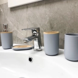 Alakítson ki egységes és praktikus teret a teljes, szürke fürdőszobai szettel. A tartós műanyag és a természetes fa részletek kombinációja modern dizájnt hoz, amely modern és klasszikus fürdőszobákba is illik. A szappanadagoló króm pumpája és a WC-kefe minőségi fém nyele a funkcionalitást és az esztétikát egyaránt kiemeli.