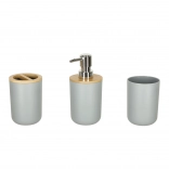 Minden elem a mindennapi kényelmet szolgálja – a bambusz betétes szappantartó szárazon tartja a szappant, az adagoló pontosan adagolja a folyékony szappant, a fogkefeszervező és a pohár rendet tart a mosdónál, míg a WC-szett és a szemetes a teljes fürdő tisztaságát biztosítja.