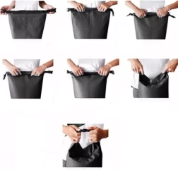 Görgessük fel a szélét legalább háromszor, majd csatoljuk össze – egyszerű és hatékony tömítés a víz és a véletlen kinyílás ellen.