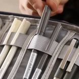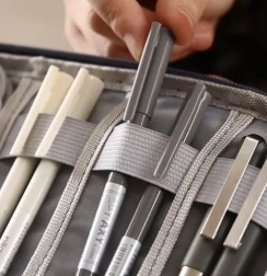 Belül 6 hálós zseb ad gyors áttekintést, míg 8 elasztikus pánt biztos rögzítést nyújt a kiegészítőknek. A cipzáras zárás védi a tartalmat, a habos párnázás tompítja az ütéseket, a csuklópánt pedig megkönnyíti a hordozást. Munkához, tanuláshoz és utazáshoz egyaránt ideális.