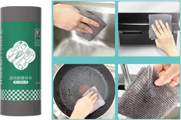 Praktikus szett a mindennapi takarításhoz: szürke konyhai törlők és szivacsok 20 × 9 cm méretben, 25 darabos tekercsben. Ideális gyors törléshez, tisztításhoz és fényesítéshez a konyhában és az otthonban. A kompakt csomagolásnak köszönhetően mindig kéznél vannak és könnyen letéphetők. Nedvszívó anyag, sokoldalú felhasználás és takétkos csomagolás a fáradságmentes tisztaságért.
