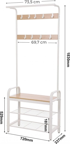 Az akasztó 9 akasztóval rendelkezik a ruhák és kiegészítők felakasztásához, valamint két cipőpolccal az előszoba rendezésére.