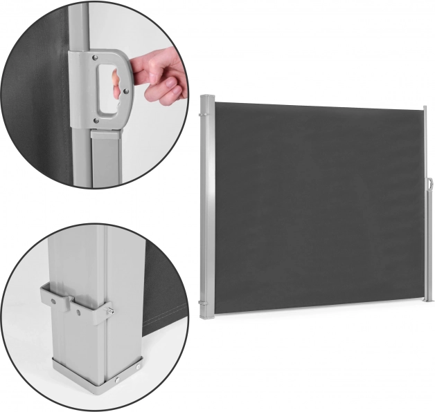 Ez a kihúzható oldalsó paraván okos és stílusos megoldás kültéri és beltéri terekhez egyaránt. Privát zónát alakíthatsz ki vele a pihenéshez, megvéd a erős napsütéstől és a széllökésektől, miközben modern, antracit megjelenésével feldobja a környezetet. Használható teraszon, erkélyen, pergola mellett, illetve praktikus mobil térelválasztóként műhelyben vagy irodában.