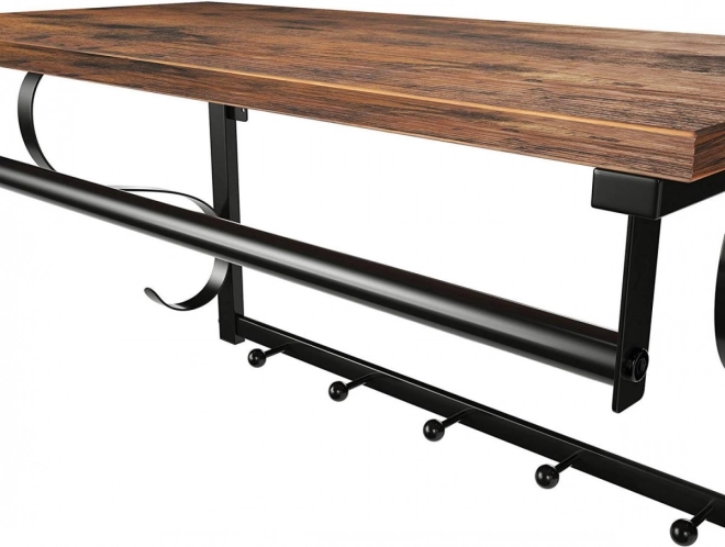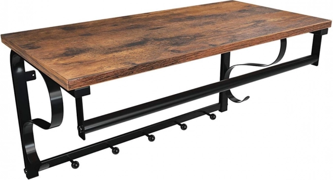 Ez az univerzális fali polc akasztóval rendet tart és helyet takarít meg. A felső stabil polc ideális virágok, könyvek, dobozok vagy dekorációk számára, míg az 5 akasztó és a rúd megbízhatóan elbírja a kabátokat, dzsekiket, táskákat és kulcsokat. A masszív fémkeret és a rusztikus barna színű, tartós lap remekül illik a modern és ipari enteriőrökhöz.