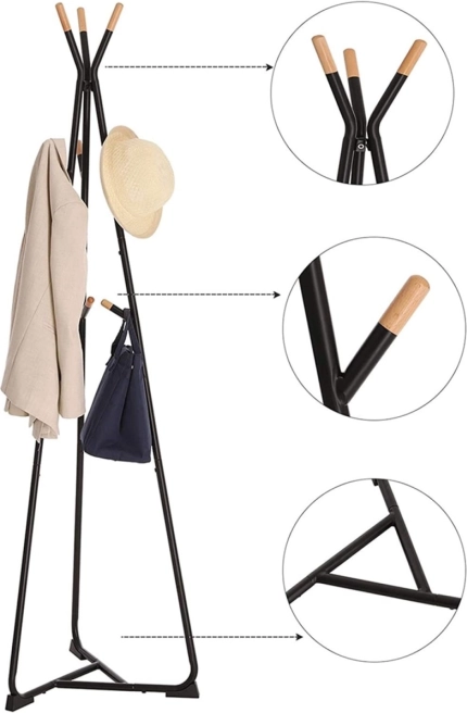 A masszív fém szerkezet és a háromszög alakú alap nagyobb terhelés mellett is kiváló stabilitást biztosít. A biztonságos lábak megvédik a padlót a karcolásoktól, a különböző magasságú akasztók pedig megkönnyítik a használatot a gyerekeknek és a felnőtteknek egyaránt. A 49 × 49 × 172 cm-es, kompakt méret a kisebb előszobákba is remekül befér.