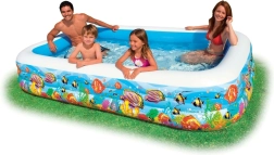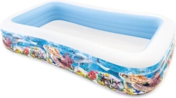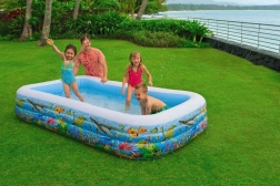 Élvezze gyermekeivel együtt a vízi szórakozást közvetlenül a kertjében! A felfújható, víz alatti világ motívummal díszített medence elegendő helyet biztosít az egész családnak.