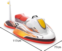 Szórakoztató és biztonságos gyerek felfújható vízijármű robogó formában a INTEX márkától, amely stabilitást, kényelmes ülést és praktikus kapaszkodót a biztos fogáshoz kínál. A széles kialakításnak köszönhetően játék közben nem borul fel, könnyen felfújható, leeresztve pedig strandtáskába is befér. Ideális medencébe, tóhoz és nyugodt vizekre.