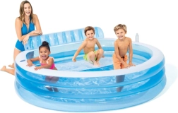 INTEX felfújható családi medence tágas fürdőzést kínál gyerekeknek és felnőtteknek, beépített háttámlás paddal a kényelmes pihenéshez és italtartókkal a maximális kényelemért. Tartós PVC anyag, gyorsleeresztő szelep és mellékelt öntapadós javítófolt teszi ideális választássá a kertbe forró napokon.