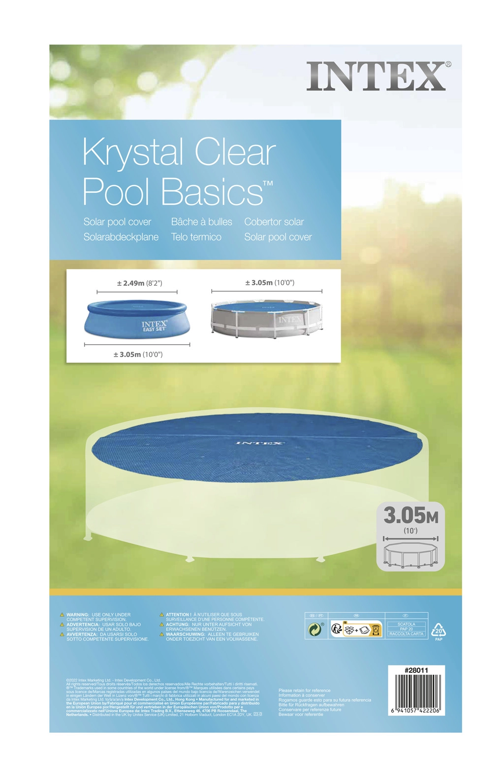 Praktikus INTEX napelemes takaró 305 cm átmérőjű kör alakú medencékhez, hatékonyan melegíti és megtartja a víz hőmérsékletét, egyben csökkenti az éjszakai hőveszteséget, és védi a víz felszínét a levelektől és szennyeződésektől. A buborékos szerkezetnek köszönhetően átengedi a napfényt és javítja a víz hőszigetelését.