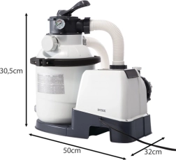 Az INTEX nagy teljesítményű homokszűrője akár 5700 l/ó átfolyással kristálytiszta vizet biztosít föld feletti medencéjében. A Hydro Aeration Technology a szűrést és levegőztetést ötvözi a jobb víztisztaság, frissesség és vízminőség érdekében. Energiatakarékos, hatékony működés, kovasavas vagy üveg homokkal, illetve szűrőgolyókkal is használható. Praktikus időzítő az automatikus ciklusokhoz és ötszelepes váltószelep az egyszerű kezeléshez.