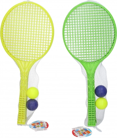 Szórakoztató puha tenisz készlet, amely alkalmas kertbe és vízpartra is. Tartalmaz 2 ütőt, 49 cm hosszú, valamint 2 puha labdát a biztonságos játékhoz. Elérhető 2 színváltozatban – zöld és sárga.