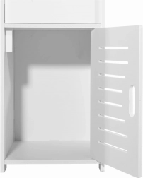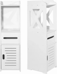 Ez a keskeny, fehér szekrény úgy lett tervezve, hogy a nagyon szűk helyeket is hatékonyan kihasználja. Nyitott és zárható tárolók teszik lehetővé a tisztítószerek vagy kozmetikumok elrejtését, miközben a gyakran használt dolgok kéznél maradnak. Levegős, modern megjelenése könnyedséget és tisztaságot kölcsönöz a térnek.