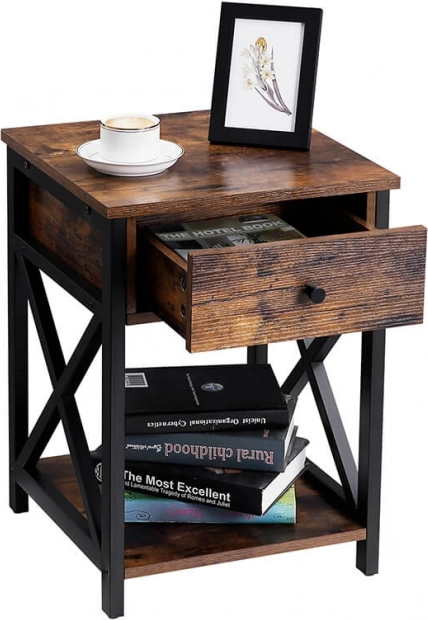 Ez a rusztikus szekrény fiókkal ideális választás hálószobába vagy nappaliba. Remekül használható könyvek, ébresztőórák, virágcserepek tárolására, illetve szépen bekeretezett fényképek kiállítására.