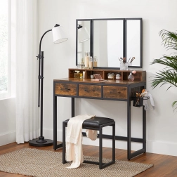 Elegáns, rusztikus stílusú kozmetikai fésülködőasztal, ideális a mindennapi szépségápoláshoz. A nagy, felhajtható tükörrel és kényelmes székkel komplett szett az Ön kényelmére tervezve.