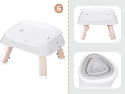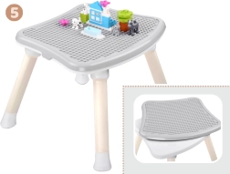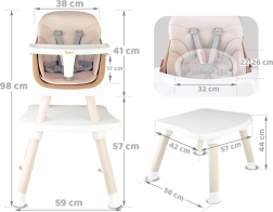 - 6 funkció egyben: magas etetőszék, székre helyezhető ülőrész az asztalhoz, alacsony szék tálcával, szék asztallal, asztal kockaépítő lappal, alacsony zsámoly