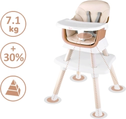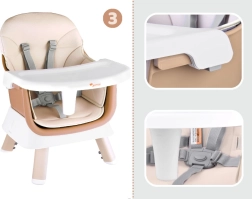 Univerzális 6 az 1-ben gyerek etetőszék 6 hónapos kortól, amely együtt nő a gyermekkel és több felhasználási módot kínál. Moduláris kialakításának köszönhetően könnyen igazítható az étkezőasztalhoz vagy a gyereksarokhoz. Levehető és mosható tálca, 5 pontos biztonsági övek, lecsúszásgátló blokk és csúszásmentes lábvégződések gondoskodnak a biztonságról és a kényelemről. A légáteresztő kárpit könnyen tisztítható és alkalmas a mindennapi használatra.
