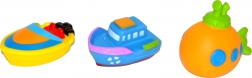 Fedezd fel a fürdési mókát három puha gumijáték szettjével – két hajóval és egy tengeralattjáróval. Ideális már 0+ kortól, biztonságos a kis kezeknek és könnyen megfogható. Puhа anyag, biztonságos vízi játék és könnyű tisztítás garantálja az örömteli fürdést minden alkalommal.