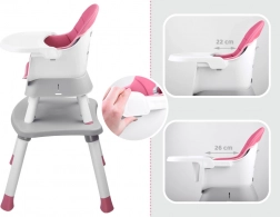 Az etetőszék támogatja a közös étkezést – a felépítmény könnyen az asztalhoz tolható, hogy a gyermek elsajátítsa a helyes étkezési szokásokat. A két magassági beállításnak köszönhetően használható magas etetőszékként, alacsony székként, szék asztalkával, asztal építőkocka laphoz és alacsony zsámolyként is.