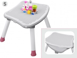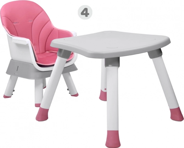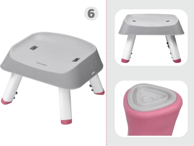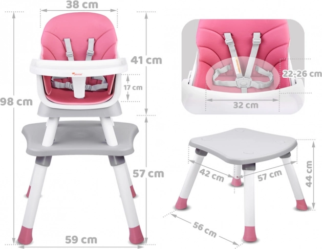 - 6 funkció 1-ben: magas etetőszék tálcával, felépítmény étkezőszékre, alacsony szék tálcával, szék + asztal, asztal kockaépítő laphoz, alacsony zsámoly