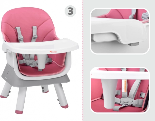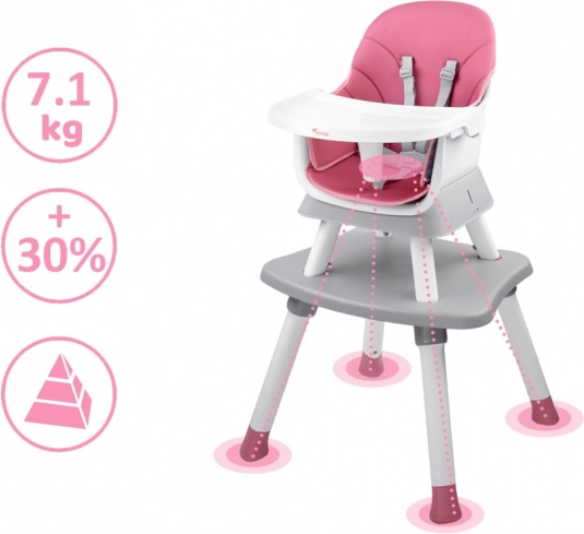 Multifunkciós gyermek etetőszék 6 az 1-ben megoldással, 6 hónapos kortól, amely együtt nő a gyermekkel. Kínál magas és alacsony üléspozíciót, felépítményt étkezőszékre, játékasztalt és zsámolyt. Rendelkezik 5 pontos biztonsági övekkel, levehető és könnyen tisztítható tálcával, csúszásgátló lábakkal és könnyen karbantartható, légáteresztő huzattal.
