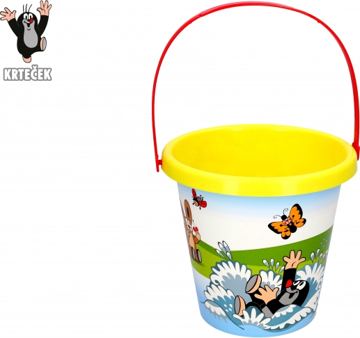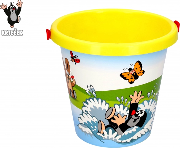 Praktikus gyerek vödör a népszerű KISVAKOND mintával, 1,5 l űrtartalommal, sárga színben. Tartós műanyag anyagból, biztonságos kivitelben 3 éves kortól – ideális homokozóba, kertbe és vízpartra.