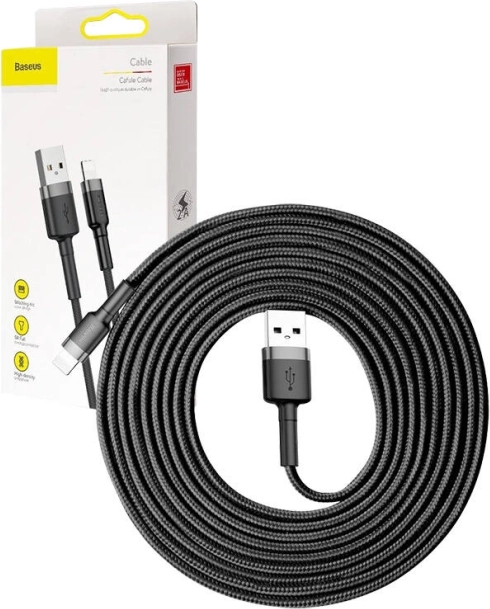 A meghosszabbított BASEUS Cafule USB–Lightning kábel 3 méteres hosszal szabadságot ad töltés és telefonhasználat közben a kanapén, az irodában vagy az ágy mellett. A minőségi kivitelnek, a nylon fonatnak és a megerősített alumínium csatlakozóvégeknek köszönhetően a kábel rendkívül ellenálló a hajlítással és a kopással szemben.