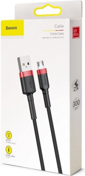 Tartós töltő- és adatkábel a BASEUS CAFULE sorozatból, micro USB csatlakozóval, 3 m hosszban és 2 A áramerősséggel. Gyors töltést kínál, beleértve a Quick Charge 3.0-t, akár 480 Mb/s adatátvitelt, masszív nylon fonott köpenyt, megerősített csatlakozókat és praktikus tépőzáras pántot a könnyű tároláshoz.