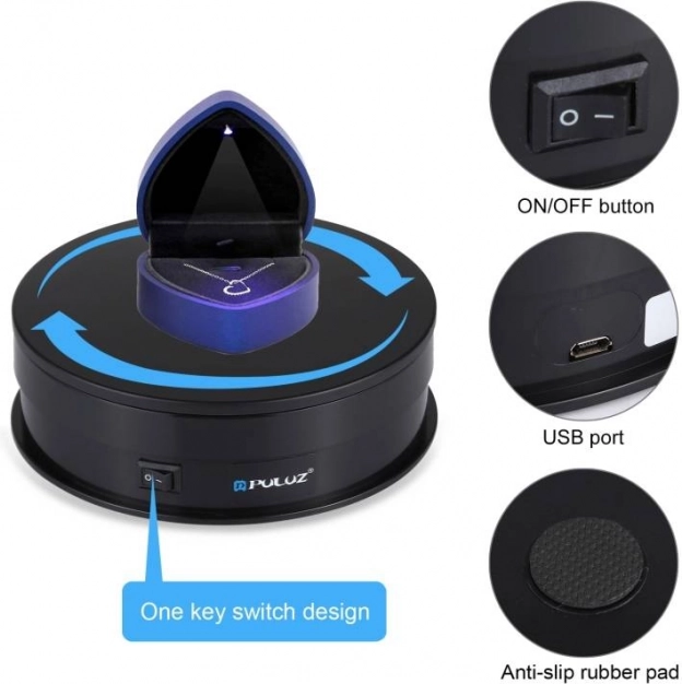 A panoramatikus forgó állvány Puluz tökéletes megoldás különféle tárgyak, például ékszerek, órák vagy kis táskák elegáns kiállítására. Ez az állvány könnyű kezelést kínál egyetlen gomb segítségével, ezáltal megkönnyítve a kezelését a bekapcsolás, kikapcsolás vagy a forgás irányának megváltoztatása során.
