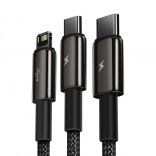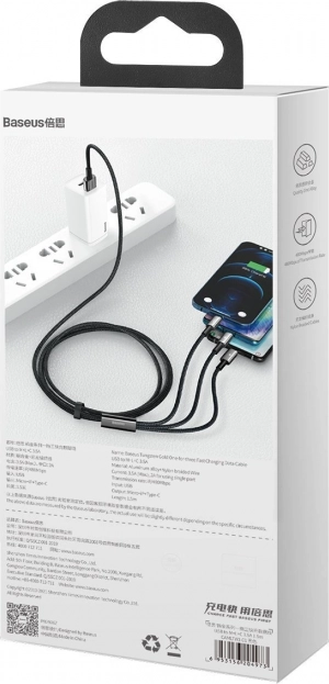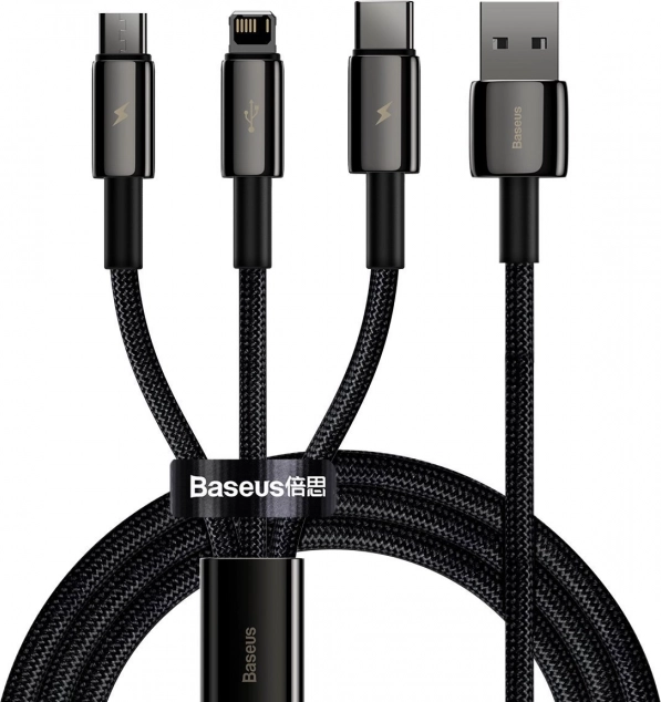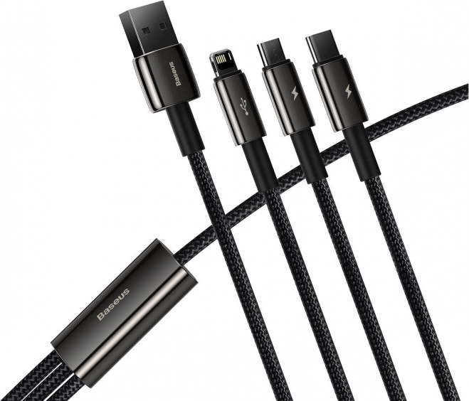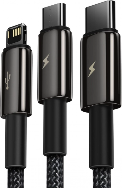 Olyan kábelt keres, amely minden eszközéhez megfelel? A Baseus Tungsten Gold 3 az 1-ben a Lightning, az USB‑C és a micro USB csatlakozókat ötvözi, így könnyedén töltheti iPhone-ját, modern androidos eszközeit, régebbi készülékeit vagy kisebb elektronikáit. A legfeljebb 3,5 A áramerősség és a legfeljebb 66 W teljesítmény gyors energiautánpótlást biztosít, miközben a lightning ág 480 Mb/s adatátvitelt nyújt.